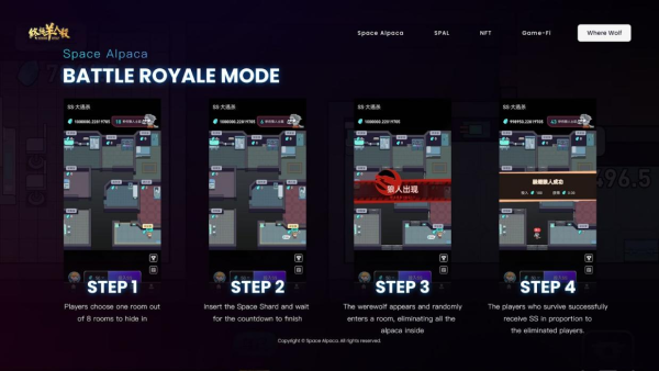 A group of space alpacas completed their mission and was preparing to return when they discover a shortage of rocket fuel. They make an emergency landing at the Wolf Star, which is abundant with Space Shard. As they replenish their supplies and prepare to take off, a werewolf sneaks onto the spacecraft and initiates a battle of slaughter. The group of space alpacas takes refuge in the eight rooms of the spaceship, seeking to evade the werewolf. The werewolf slowly approaches the alpacas, randomly annihilating Alpacas in a room, Space Shards from the slain room is distributed to other players. In “Where Wolf”, every choice is crucial, and every decision could be the line between life and death.